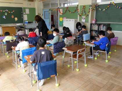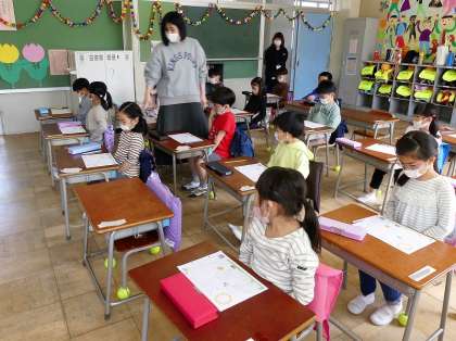 「早くお勉強がしたい」と言っていた1年生です。この時間は、えんぴつの持ち方を学習し、縦や横、斜めの線を書きました。みんな集中して、ていねいに書いていました。