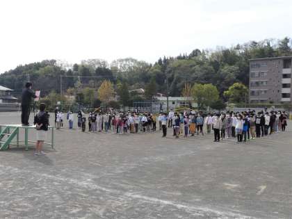 全校朝会の校長先生の話は、学校教育目標についてでした。「四つの目標を6年生が終わるまでに、達成しましょう」と、「なかよくする子」に関連させて「もう一つのうさぎとかめ」の話がありました。