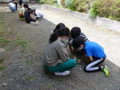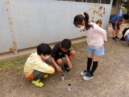 理科の学習で、ものが燃えるしくみについて学習しました。缶の下に穴を開けたものと開けていないものとで燃え方を比べています。