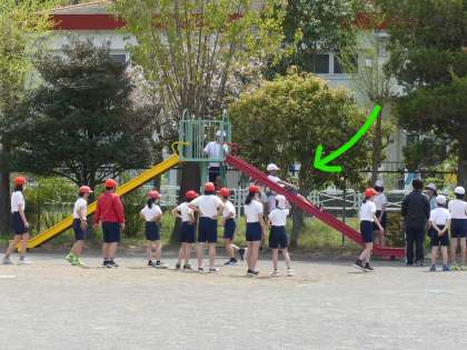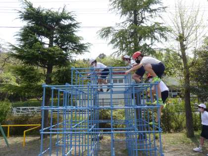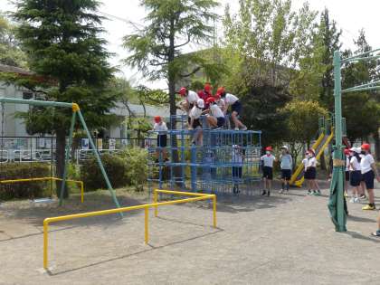 6年生が体育の授業で、校庭の固定施設を使った運動を行っていました。滑り台もひさしぶり、懐かしさもあり、みんな笑顔でした。