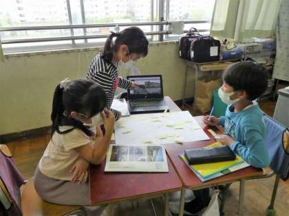 3年生の社会科では、学区域や八王子市について学習します。まずは、学校の周りの様子を調べました。東側、西側など、東西南北それぞれの方位に何があるか、タブレットを活用して確認しました。