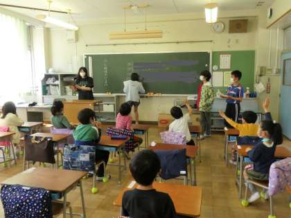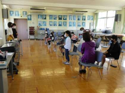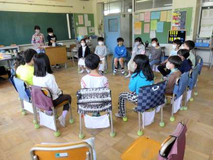 1年間、なかよし班で遊んだり、サツマイモを育てたりする仲間との初顔合わせです。6年生は、1年生を教室まで迎えに行きました。1年生は、「迎える会」でプレゼントされた名札をつけています。