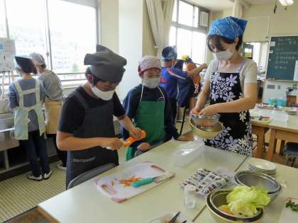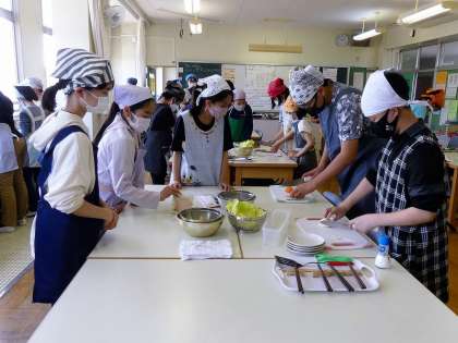 おいしい野菜炒めのポイントは、「大きさをそろえて切る」「炒める順番とタイミング」「炒め方」「味付け」です。6年生は、グループで協力、分担して、野菜炒めを作りました。