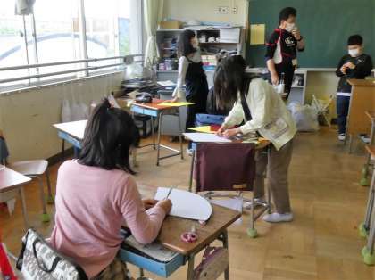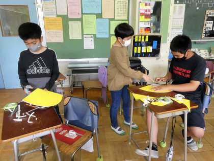 御神楽で使用する扇を作りました。これは練習用ですが、自分専用なのでみんなていねいに作っていました。5年生は、黄色い扇です。