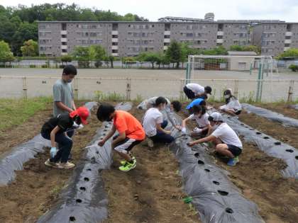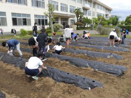 6年生は、苗植えの準備をしました。苗を植える間隔を決めて、マルチシートに穴をあけました。短い時間で、テキパキと作業していました。