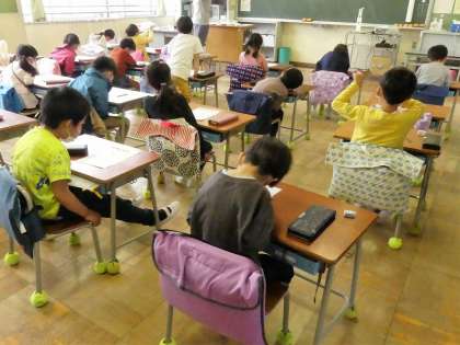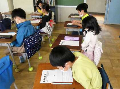 1年生は、今日から5時間授業が始まりました。教室を覗くと、子供たちは、じーっと何かを見つめていました。