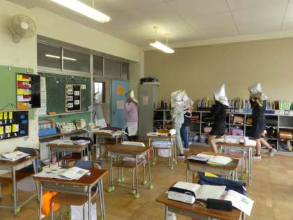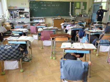 今日の避難訓練は、地震発生時の基本的避難行動をねらいとして、行いました。緊急地震速報のアラートを聞いて、すぐに自分の身を守る行動ができていました。「とっさに身を守る」ためには、どうしたらよいのか、よく考えるのが宿題です。電車やバスの中にいたらどうするか、机の無い教室にいたら、家の中にいたら…。お家の方と話をしてみましょう。