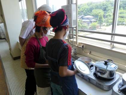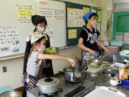 材料は、人参、キャベツ、ブロッコリーです。水からゆでる野菜、お湯からゆでる野菜の違いや、包丁の使い方を学習しました。
