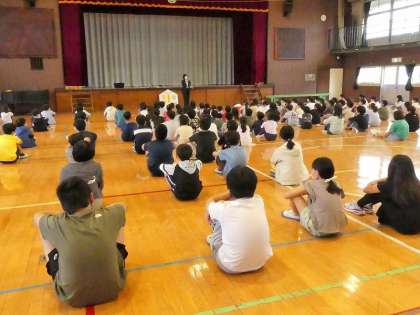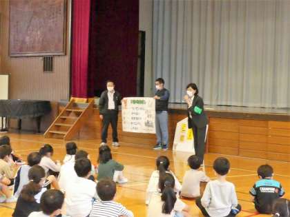 体育館に集合して、警察の方のお話を聞きました。これは、命を守るための大事な訓練で、「いかのおすし」や「ピーポ君の家」についての理解を深めたり、実際に大きな声を出して危険をまわりに知らせてみたりする等、具体的に学ぶことができました。