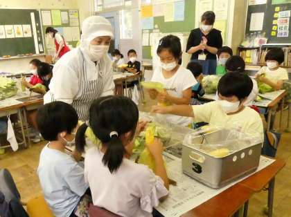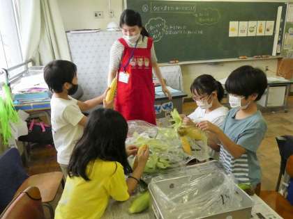 全校が給食で食べるとうもろこしなので、心をこめてむいてくれました。特にひげの部分は、とうもろこし一粒一粒とつながっているので、ひげが残らないよう丁寧に取り除きました。