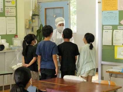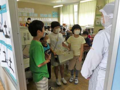 調理員さんに、日頃の感謝の気もちを伝えながら、とうもろこしを渡しました。