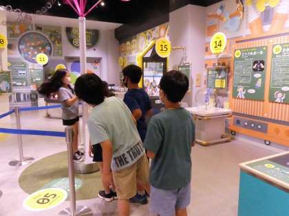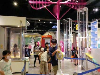 一番人気があったのは、「くるくるコプター」です。自由に回転する台の上で、ハンドルを回して上部のプロペラを回転させると、自分がプロペラと逆向きに回転してしまいます。力いっぱい回すので、終わると少しフラフラしているようでした。