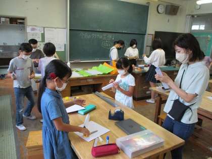 イラストクラブは、工作を合わせた空飛ぶイラストを描いて作りました。