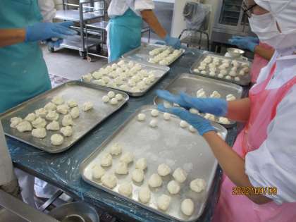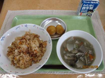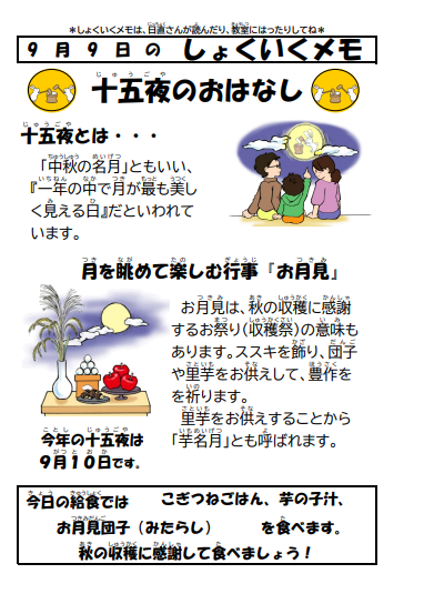 今日の給食では、里芋を使った「いものこ汁」と調理員さんたちが一つずつ手作りしてくれた「お月見だんご」を食べました。