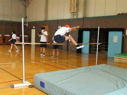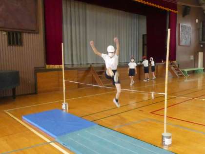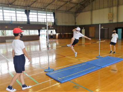 6年生は、走り高跳びの学習を始めました。練習の初めは、恐怖心をなくすために、バーの代わりにゴムひもを使って行いました。また、フォームのチェックには、友達にタブレットで動画を撮ってもらっていました。リズミカルな助走から強く踏み切り、目標記録を目指します。