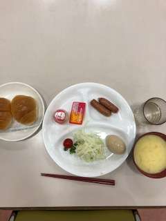 2日目の朝食は、バターロールパン、ジャム&マーガリン、生野菜、ウインナー、味付け卵、コーンスープ、ヤクルト、です。