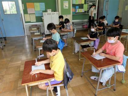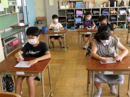 2年生の子供たちは、初めて使う「水ふで」に、興味津々でした。