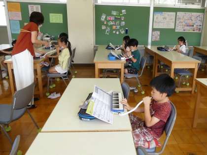 鍵盤ハーモニカで「きらきらぼし」を演奏しました。「ソソファファミミレ ソソファファミミレ」指の使い方とタンギングに気を付けながら、何回も練習していました。