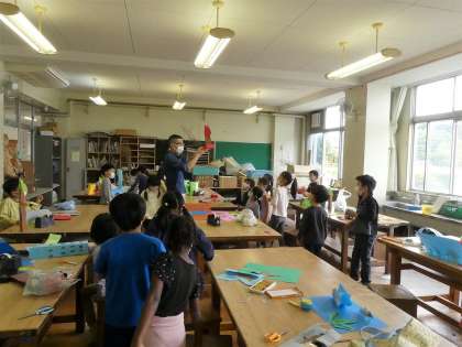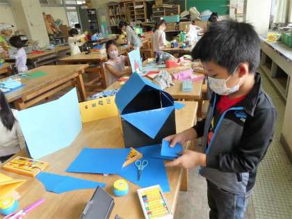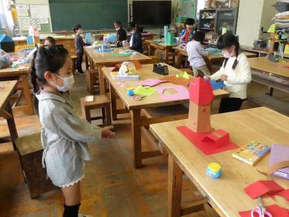 色画用紙を立つように折って、立てた形から、切ったり描いたりして、作りたいものを考えました。「折って立てる」ということは、想像以上に難しかったですが、「これじゃあ立たないな。」と、やってみながら立つまであきらめずに取り組みました。先生が、友達の作品を紹介してくれると、「ぼくもそれ作ろう!」と、良いところをまねして自分の作品に生かそうとしている姿もありました。