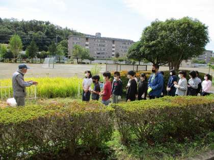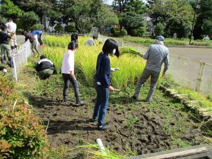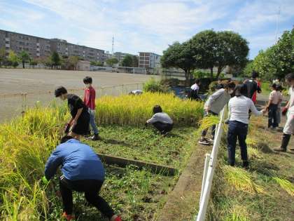 ほとんどの子が初めて鎌をにぎり、ぎこちなく稲刈りを始めましたが、 次第にコツをつかみ、作業の速度も上がりました。