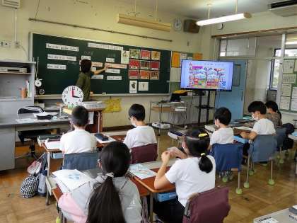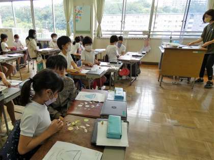 食材の言い方や、ほしいものを尋ねたり、要求したりする表現を学習しました。好きな果物をもらって、オリジナルのパフェを作ります。