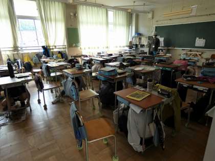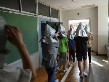 10月の避難訓練が行われました。緊急地震速報のアラートを聞いて、机の下にもぐり、家庭科室から出火したという想定で、避難しました。