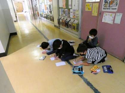 「あっこんなところにも!」「ここも顔に見える!」という声が聞こえてきました。様々なところへ行き、子供たちはすてきな感性を働かせて「ともだち」を見付け、写真を撮って(絵を描いて)いました。