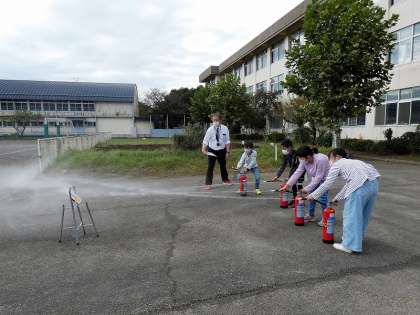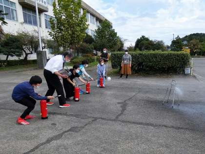 今回は水が出る訓練用の消火器でしたが、操作をすると水が出るので、子供たちは真剣に消火器訓練ができました。