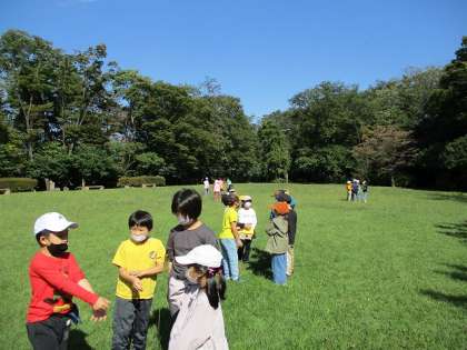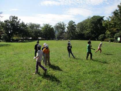 広場で、たてわり班の2年生がリーダーになって、班ごとに楽しく遊びました。おにごっこ、だるまさんがころんだ、かくれんぼで、元気いっぱい走り回りました。