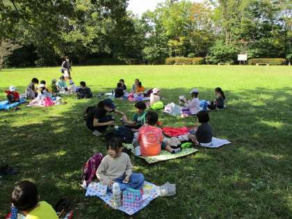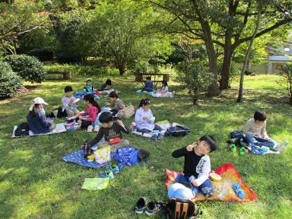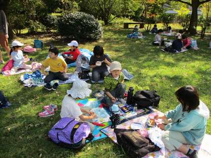 秋晴れの心地よい広場で、たてわり班ごとにおいしくお弁当をいただきました。