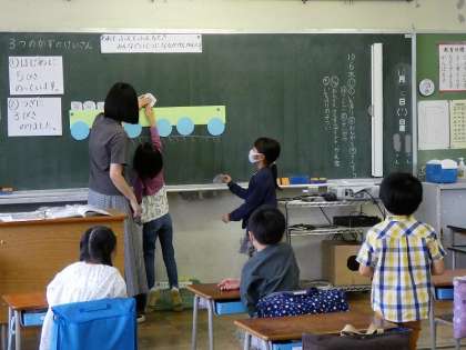 1年生は、「3つの数を足す計算を1つの式に表して考える」授業でした。提示した絵を操作しながら計算の仕方を考え、ブロックを使って、3つの数の計算方法を実感することができました。