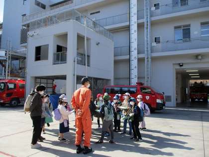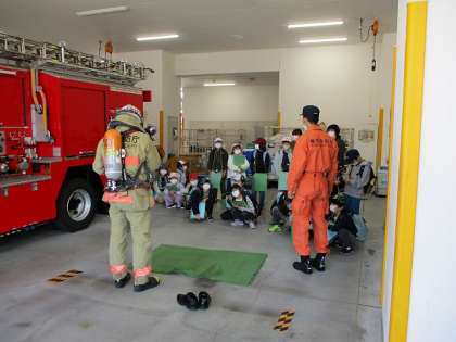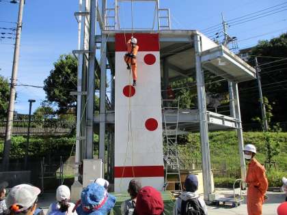 消防服に着替えて出動する様子や、ロープで壁を上って下りる様子を見せていただきました。
