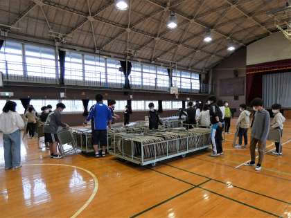 本日、1校時に5・6年生で音楽会の片付けをしました。パイプ椅子をしまい、楽器を音楽室に運びました。テキパキとよく働いていました。