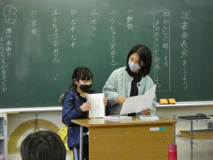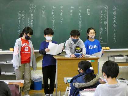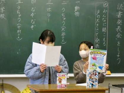 テーマは、動物、宇宙、ホラー、なぞなぞ、学校です。「なぜ、このテーマにしたのか」、「紹介する本の内容」、「読むことをすすめる言葉」などを、みんなに聞こえる声の大きさで、発表しました。