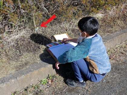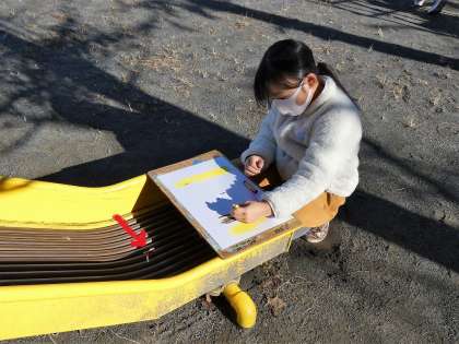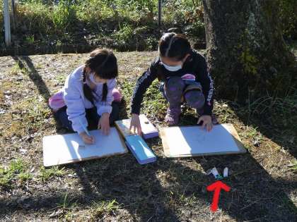 前日につくった「すきまちゃん」を校庭に連れ出して、絵を描きました。