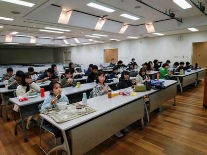 お弁当を食べています。外の予定でしたが、キャンセルの学校があったので、会議室で食べています。暖かいので、大人は喜びました。子供たちは、外がよかったなーと、つぶやいていました。