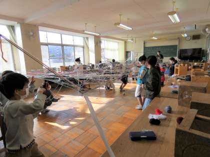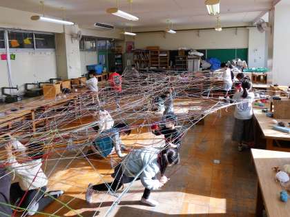 ひものつなぎ方や結び方を工夫して、場所(図工室)の様子を変えます。図工室がたくさんの色の線でおおわれ、上から見たり、下から見たり、面白い形を見付けたりしました。