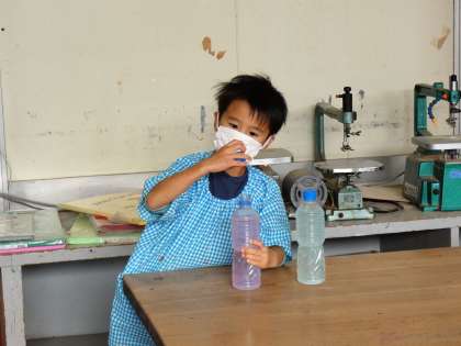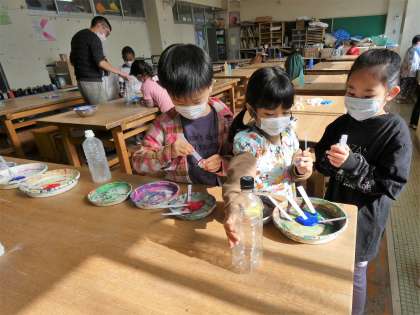 絵の具をまぜて、水をふるふるすると、色水ができます。どんな色になるのかな。
