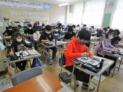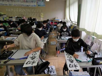 6年生の書き初めは、「初春の空」です。初のころもへんのバランスが難しいです。じっくりとお手本を見ながら練習しました。