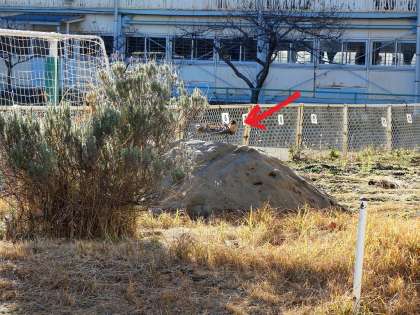 サツマイモ畑に入れる砂の上に、何かいるようです。鳥でしょうか。
