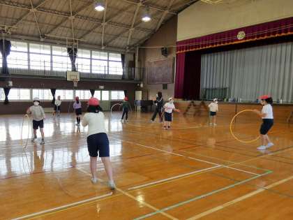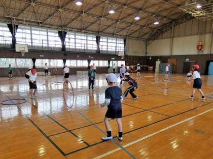 用具を操作する運動遊びとして、フラフープ(リング)を使いました。腰・手・足などの体のどこかを使って回したり、二人組になって、順回転(まっすぐ転がす)や逆回転(自分のところに戻ってくる)で転がし合ったりしました。