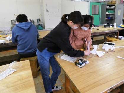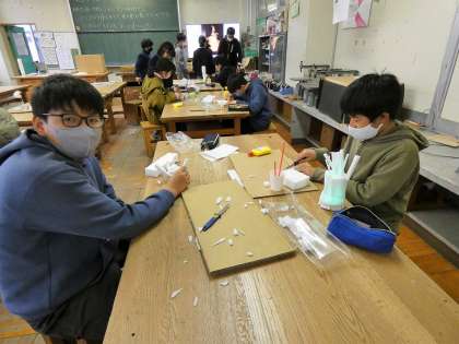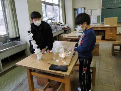 白いスポンジから、形を取り出して、LEDライトを当てると美しく輝きます。光による見え方の変化をとらえながら、形を工夫しています。