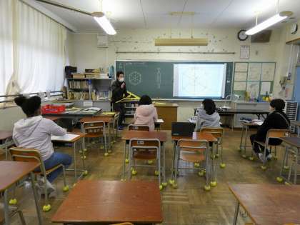 図形の学習は、作図できることだけでなく、「どうしてコンパスだけで正六角形がかけるのか」を考えていくことが大切です。長さも角度も測らずに描ける正多角形は、この正六角形だけです。理由が分かった子供たちは、応用問題の複雑な図形を描くことにチャレンジしていました。