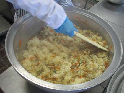 写真2枚目:炊飯釜でとりごぼうごはんを混ぜているところ