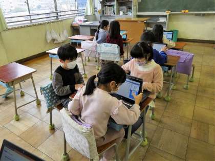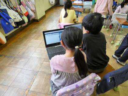 タブレットで、ドリル学習をしました。友達の準備を待っている間に問題を解いていますが、いつの間にか、友達と並んだり、向かい合ったりしています。仲良しですね。
