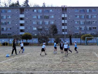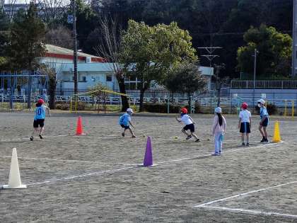 多様な動きをつくる運動遊びで、しっぽとりゲーム(子供たちは、「宝取り」と言っていました)をしていました。相手の陣地にある宝を走って取りに行くようです。みんな、走り回って元気に運動していました。
