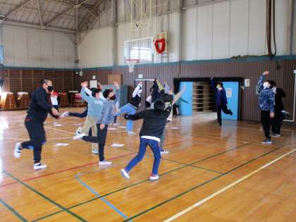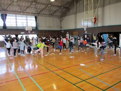 体育館で行われたピクトグラム風エクササイズは、大人気でした。スポーツの名称を英語で発音しながら、ピクトグラム風のポーズをとっていきます。どんなスポーツか分かりますか。