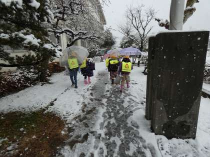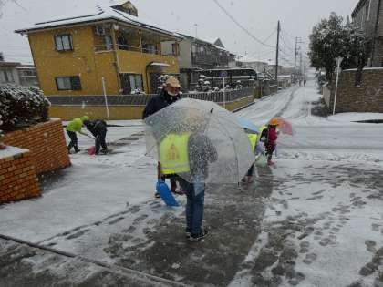 1年生が、下校しました。用務員さん、先生方が雪かきをしていますが、すぐに積もってきてしまいます。