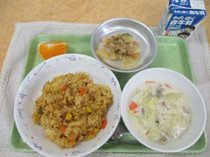 今日は「図書と給食のコラボの日」でした。今回コラボしたのは『せかいいち おいしいいスープ』という絵本です。給食では、「クリームスープ」を食べました。