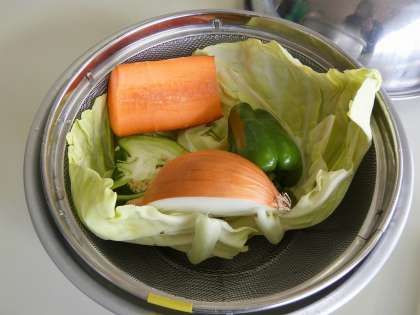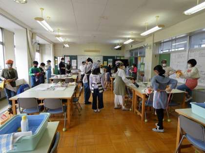 5年生は、調理実習で野菜いためを作りました。材料は、人参・ピーマン・玉ねぎ・キャベツ・なると、です。身支度をして、材料を切り始めました。